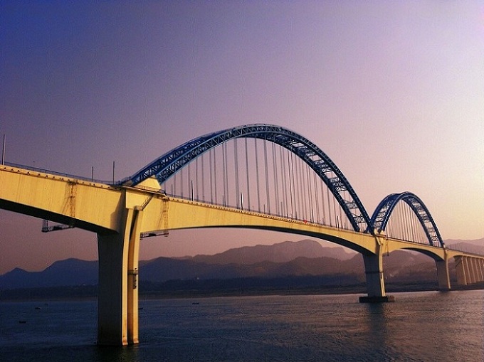 宜萬鐵路宜昌長江大橋位于宜昌港煙收壩水域,全長2527米,橋面設(shè)計(jì)為雙軌道,主梁連續(xù)剛構(gòu)跨徑達(dá)275米,在同類型鐵路橋中位居全國第一。拱肋計(jì)算跨度264米,為目前國內(nèi)鐵路最大跨度的鋼管混凝土拱。